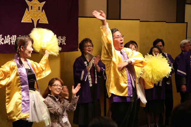 中央男性は18回生・榎島さん、ポンポン左は25回生・内田さん、右は23回生・藤尾さん